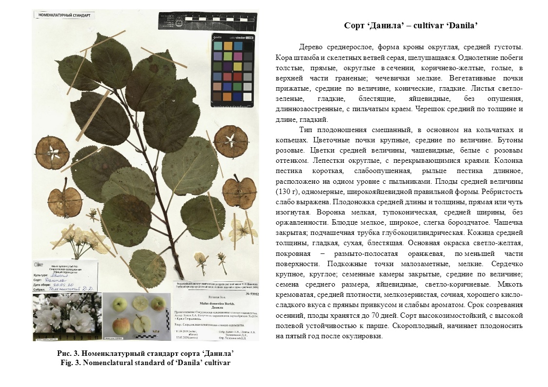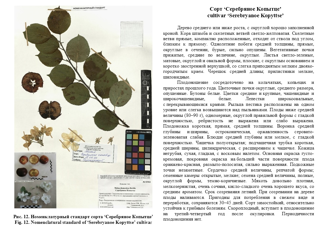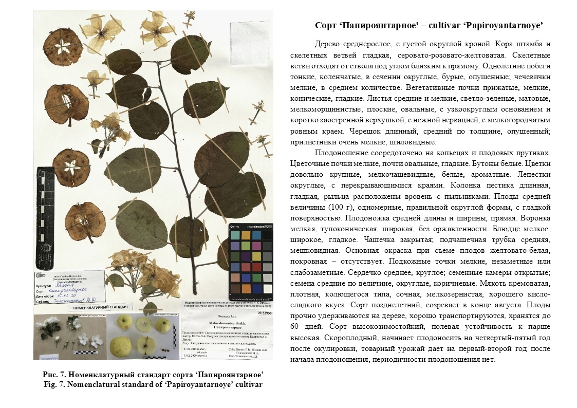 Researchers of the N.I. Vavilov All-Russian Institute of Plant Genetic Resources (VIR) and Sverdlovsk Horticultural Breeding Station developed nomenclatural standards for 18 apple cultivars released at the said station: ‘Aksyona’ (WIR-53949), ‘Blagaya Vest’ (WIR-53950), ‘Danila’ (WIR-53952), ‘Isetskoye Pozdneye’ (WIR-53953), ‘Iset Belaya’ (WIR-53954), ‘Krasa Sverdlovska’ (WIR-53955), ‘Papiroyantarnoye’ (WIR-53956), ‘Pervouralskaya’ (WIR-53957), ‘Rodnikovaya’ (WIR-53958), ‘Rumyanka Sverdlovskaya’ (WIR-53959), ‘Sverdlovchanin’ (WIR-53960), ‘Serebryanoye Kopyttse’ (WIR-53961), ‘Sokovoye 3’ (WIR-53962), ‘Tavatuy’ (WIR-53963), ‘Uralets’ (WIR-53964), ‘Fakel’ (WIR-53965), ‘Fermer’ (WIR-53966), and ‘Ekrannoye’ (WIR-53967). Nomenclatural standards serve to confirm the authenticity of a cultivar and its name. They should be kept perpetually in the scientific herbarium collection. Herbarium specimens of nomenclatural standards are formatted in accordance with the recommendations of the International Code of Nomenclature for Cultivated Plants (ICNCP), registered in the VIR Herbarium Database and included in the Herbarium of Cultivated Plants of the World, Their Wild Relatives, and Weeds (WIR).