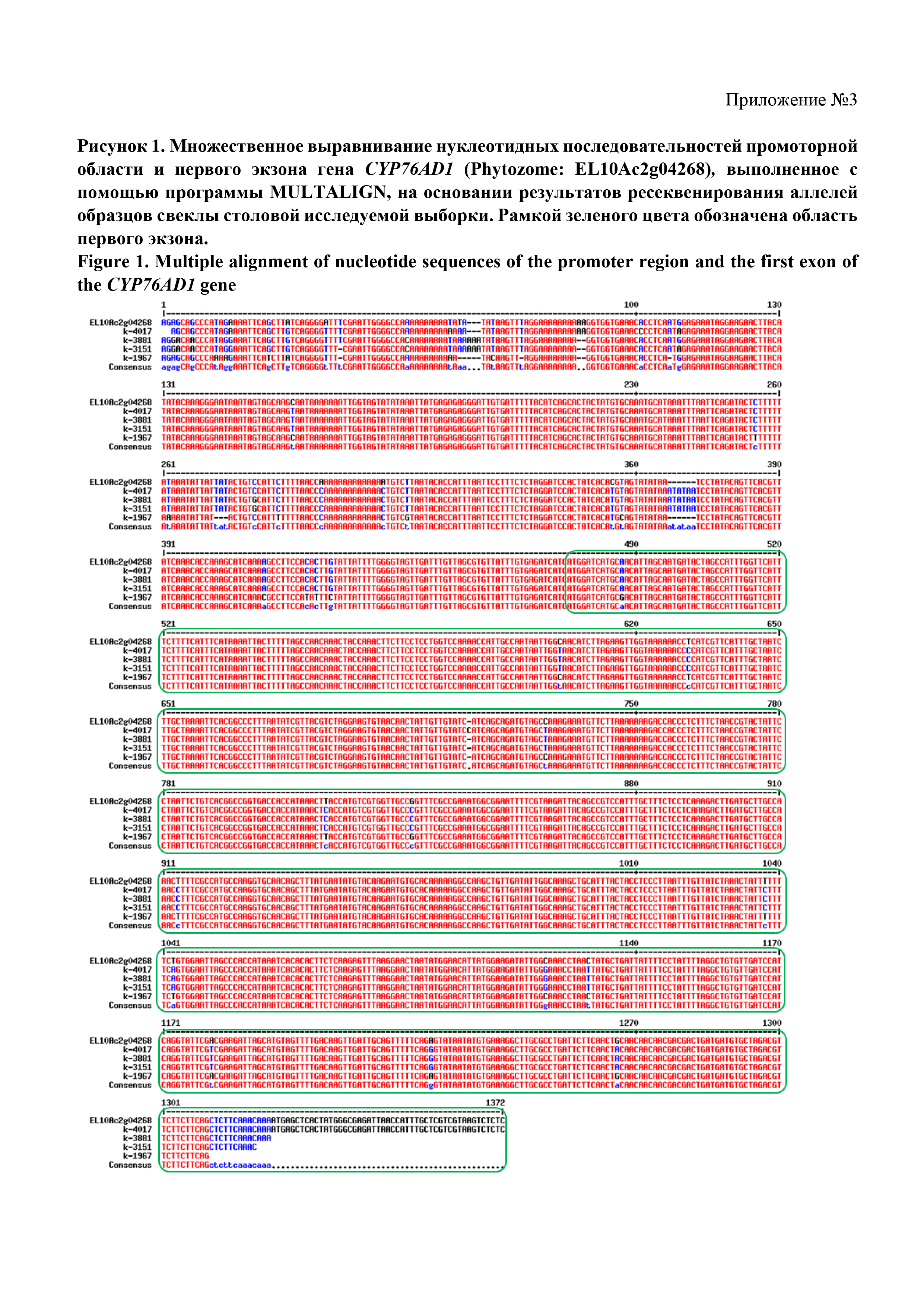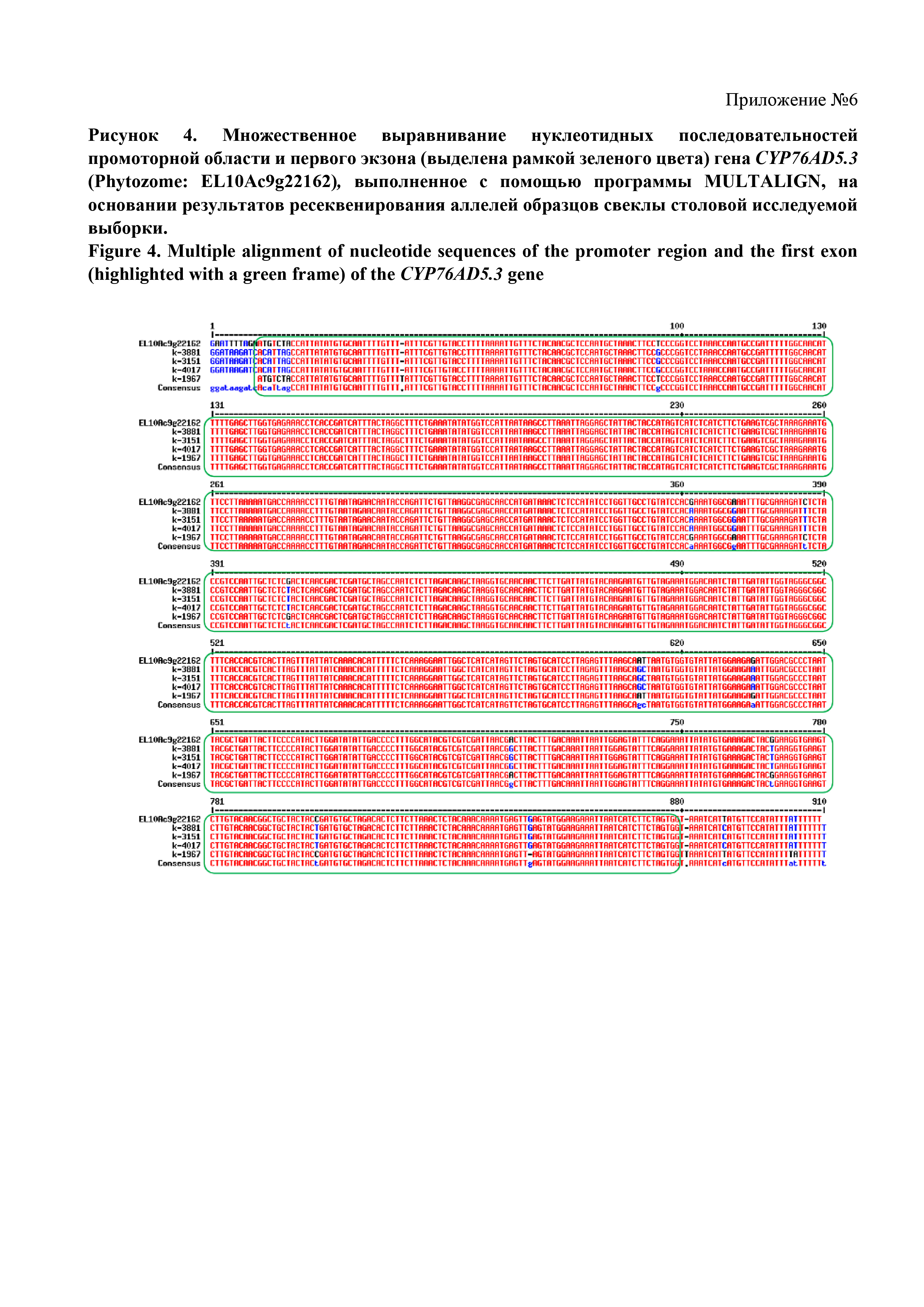 Тема | Рисунок 5. Множественное выравнивание нуклеотидных последовательностей промоторной области и первого экзона (выделена рамкой зеленого цвета) гена CYP76AD6 (Phytozome: EL10Ac9g22144), выполненное с помощью программы MULTALIGN, на основании результатов ресеквенирования аллелей образцов свеклы столовой исследуемой выборки. Рамкой зеленого цвета выделена область первого экзона. | |