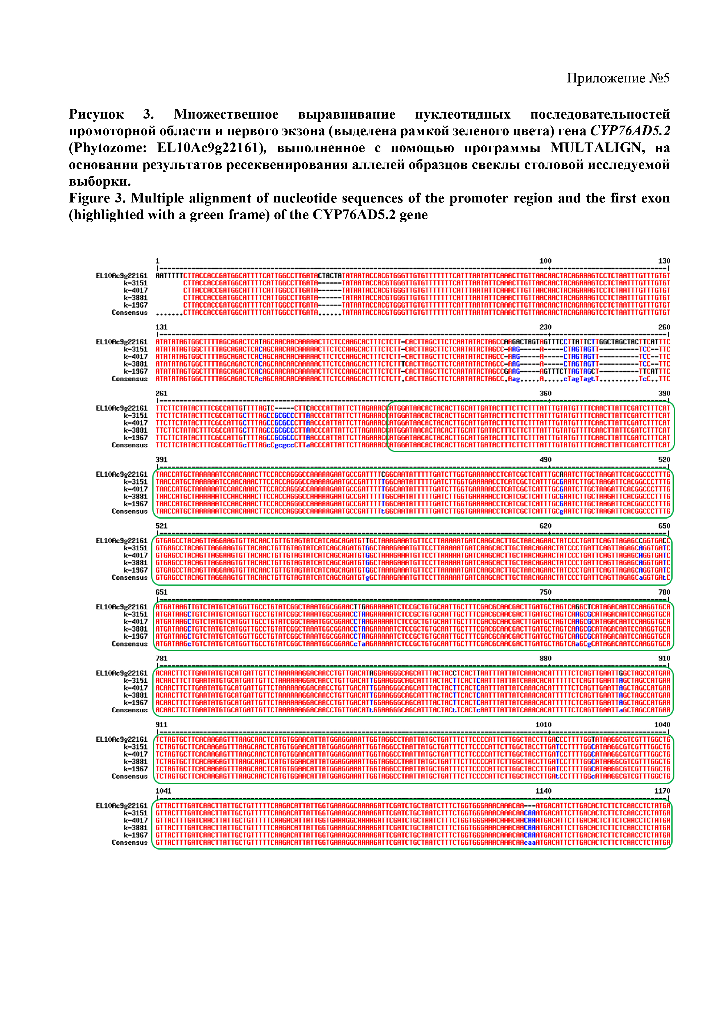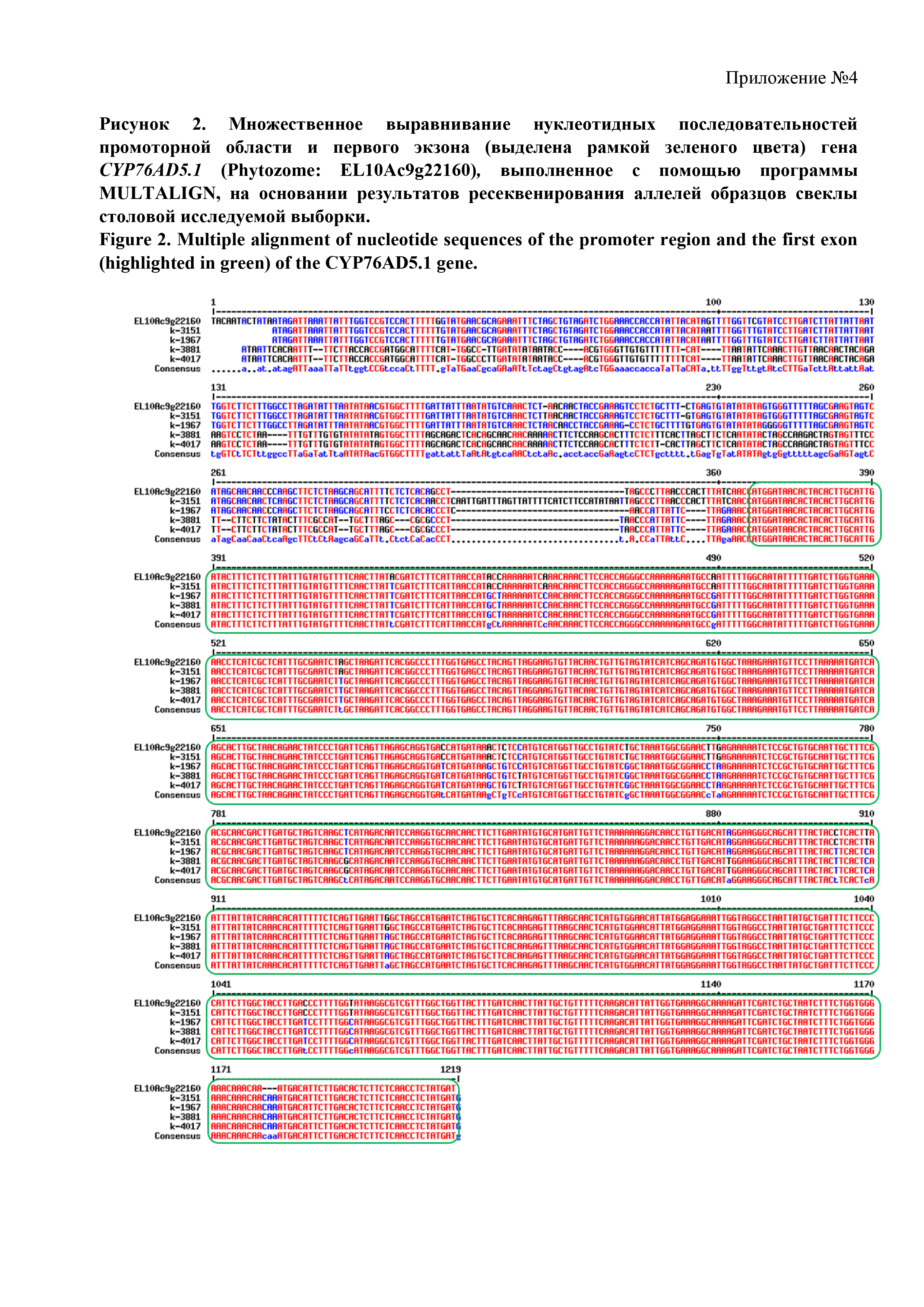 Тема Рисунок 5. Множественное выравнивание нуклеотидных последовательностей промоторной области и первого экзона (выделена рамкой зеленого цвета) гена CYP76AD6 (Phytozome: EL10Ac9g22144), выполненное с помощью программы MULTALIGN, на основании результатов ресеквенирования аллелей образцов свеклы столовой исследуемой выборки. Рамкой зеленого цвета выделена область первого экзона.