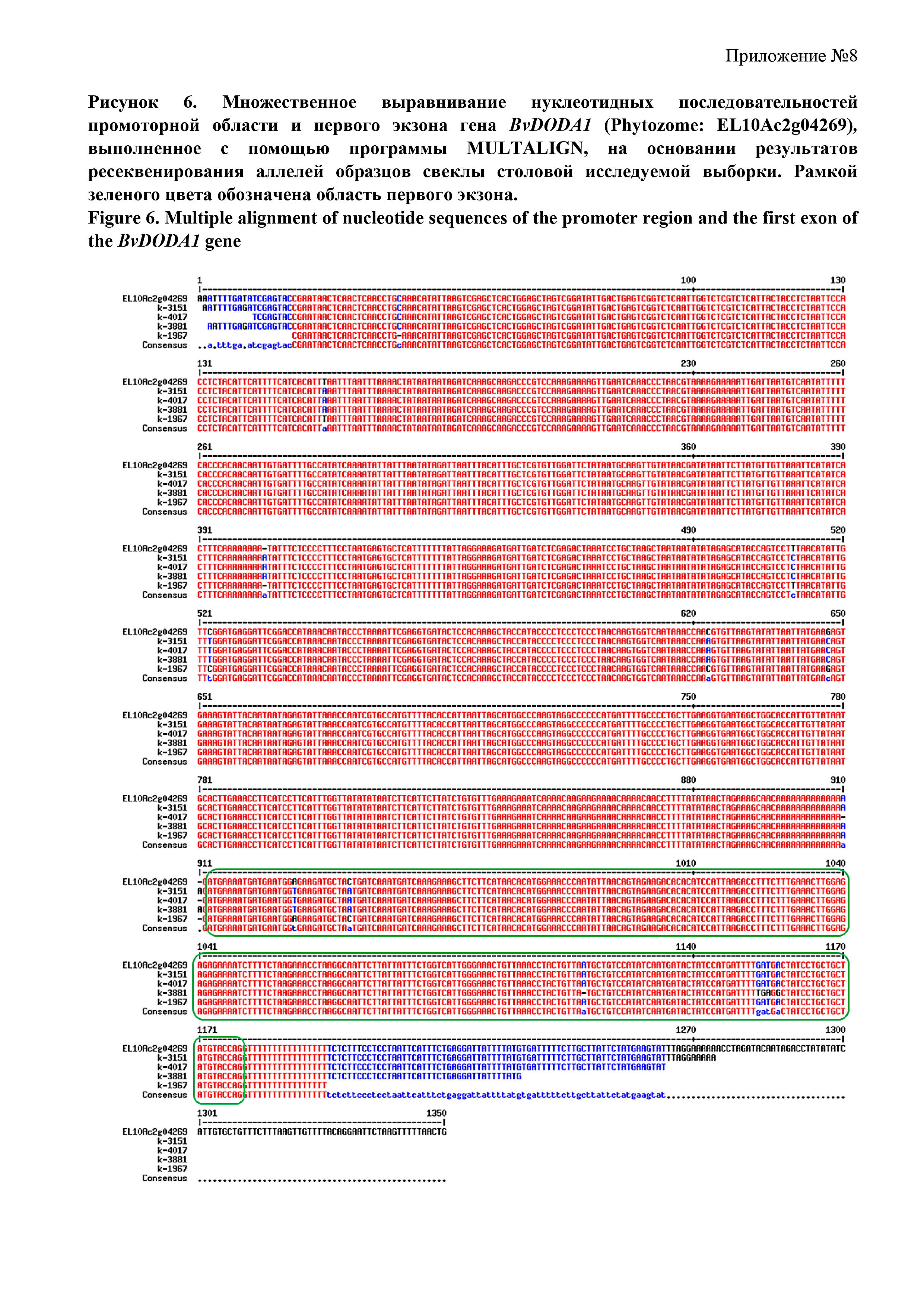 Тема Рисунок 6. Множественное выравнивание нуклеотидных последовательностей промоторной области и первого экзона гена BvDODAl (Phytozome: EL10Ac2g04269), выполненное с помощью программы MULTALIGN, на основании результатов ресеквенирования аллелей образцов свеклы столовой исследуемой выборки. Рамкой зеленого цвета обозначена область первого экзона.