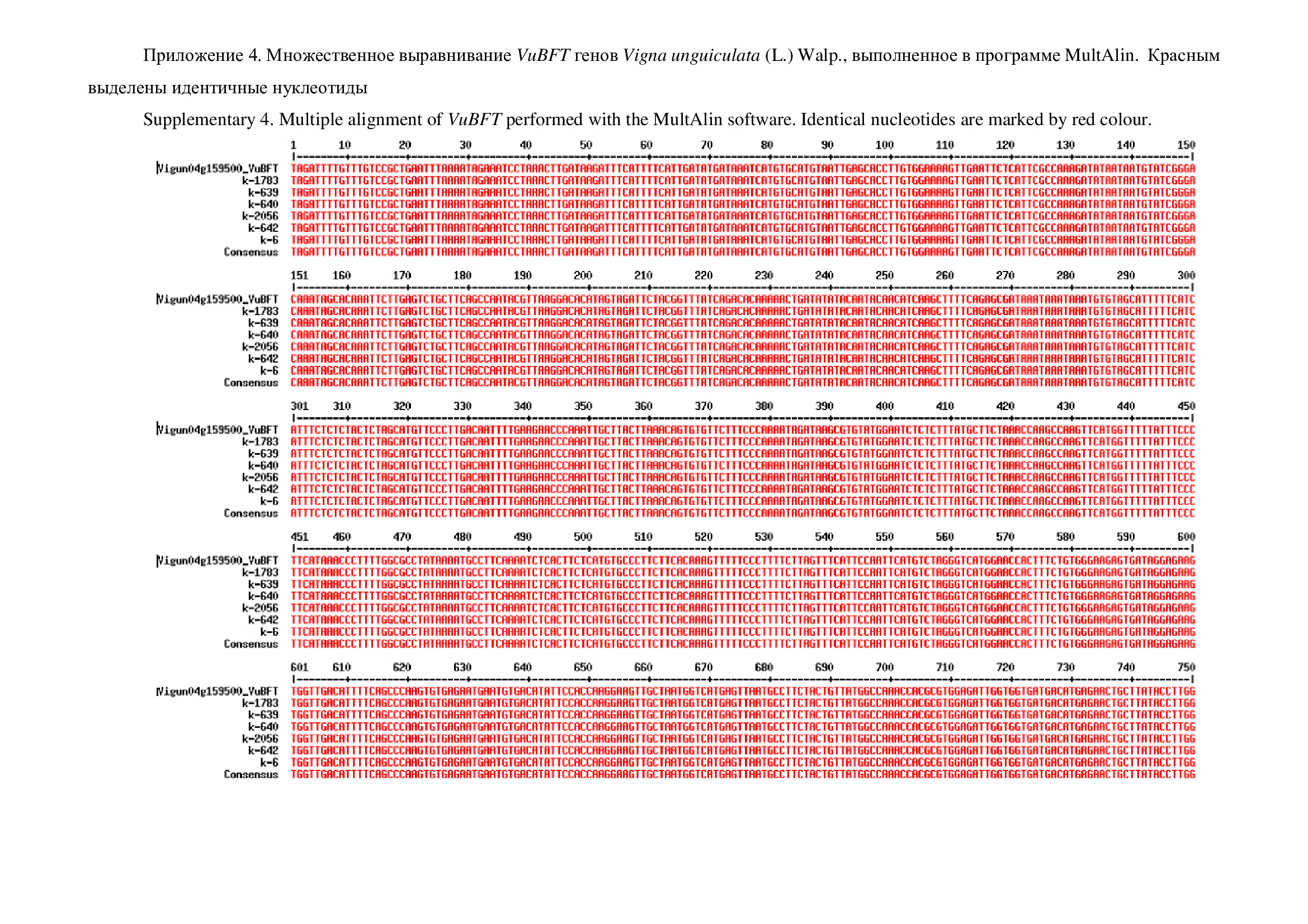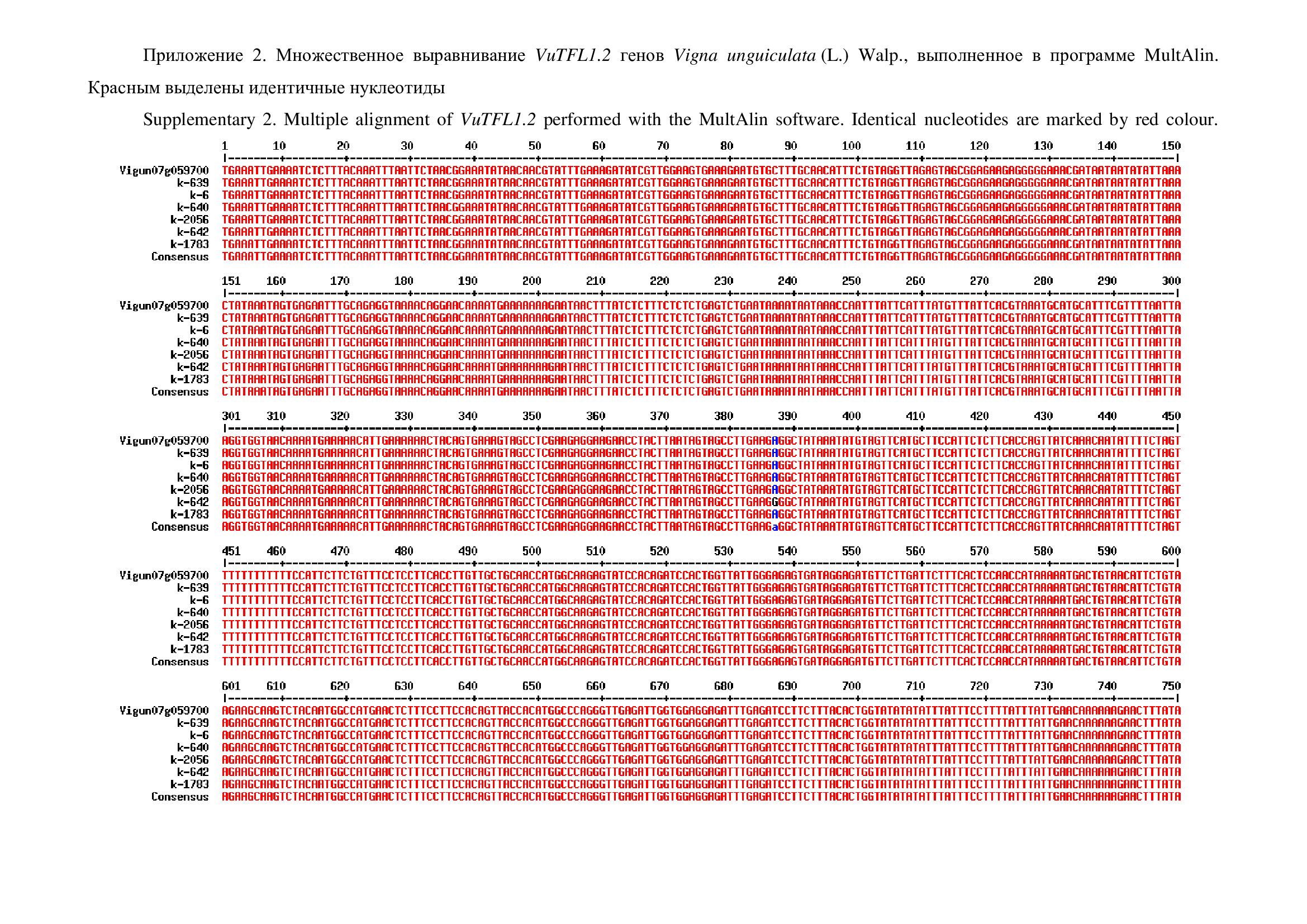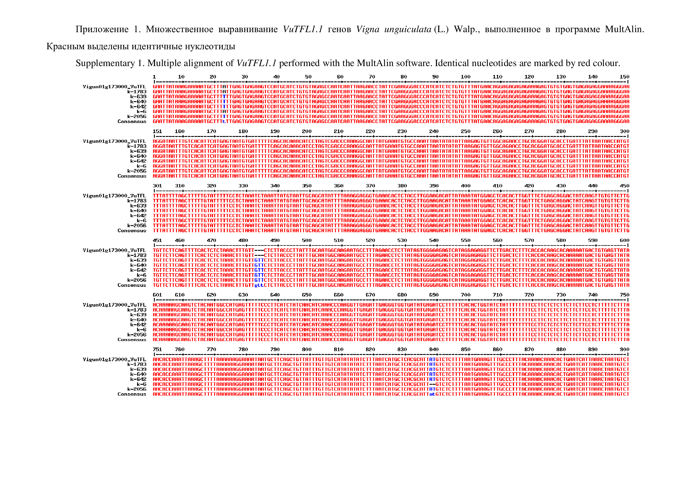 | Тема | Множественное выравнивание VuTFL1.2 генов V. unguiculata, выполненное в программе Multalign. Красным выделены идентичные нуклеотиды | |