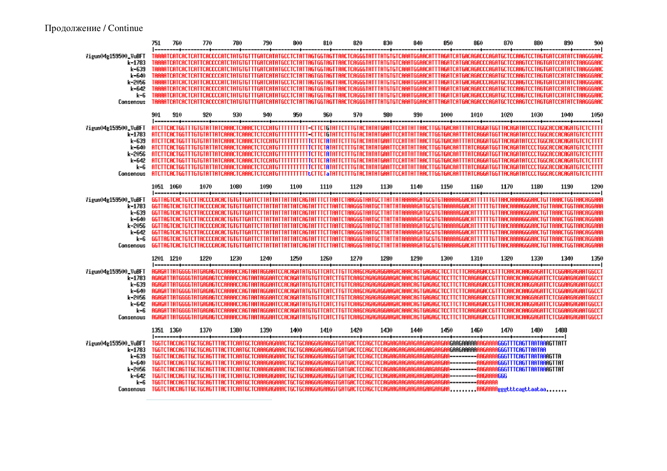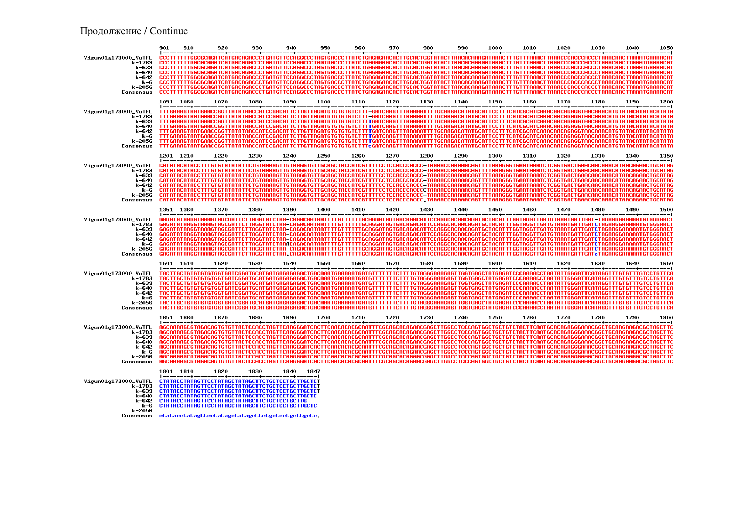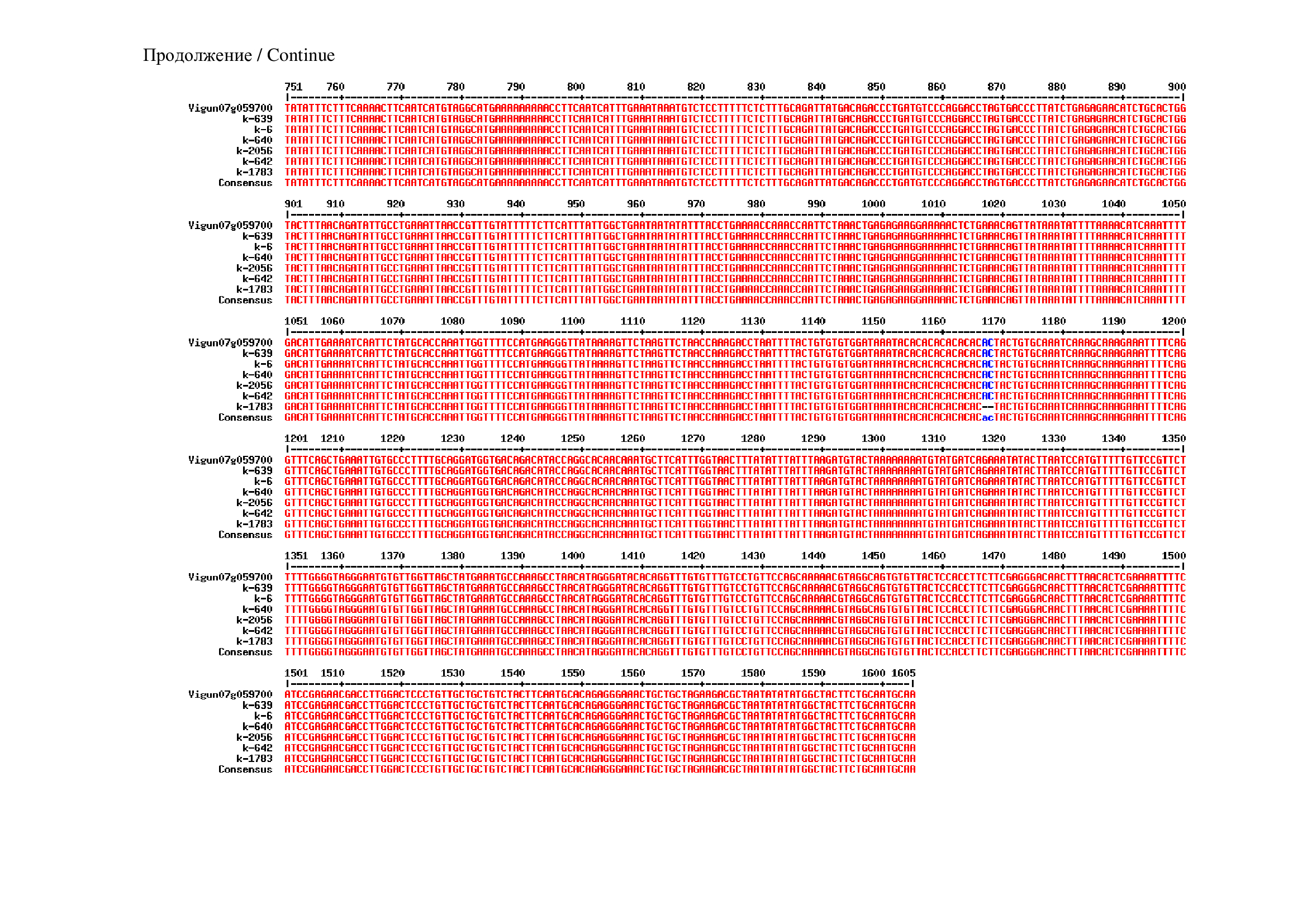 | Тема | Множественное выравнивание VuTFL1.2 генов V. unguiculata, выполненное в программе Multalign. Красным выделены идентичные нуклеотиды | |
