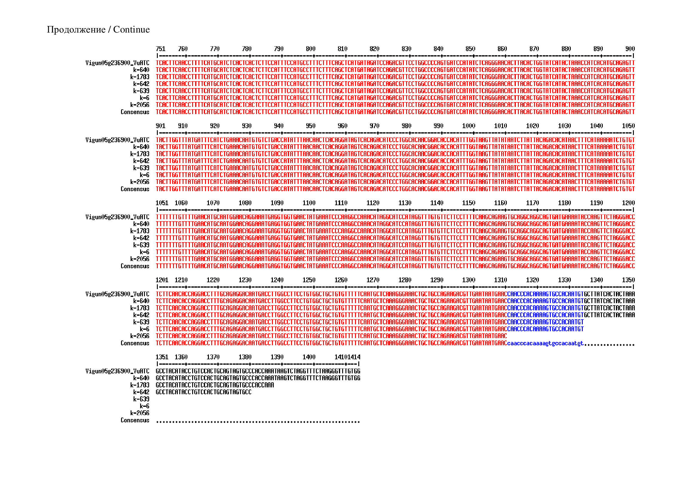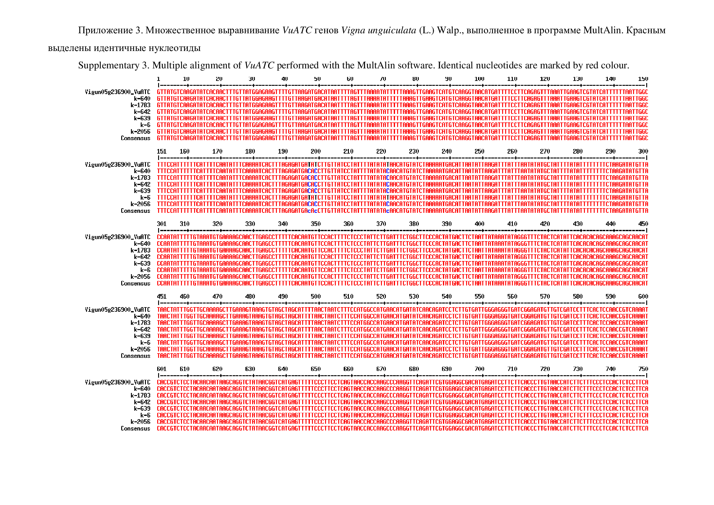 | Тема | Множественное выравнивание VuATC генов V. unguiculata, выполненное в программе Multalign. Красным выделены идентичные нуклеотиды | |