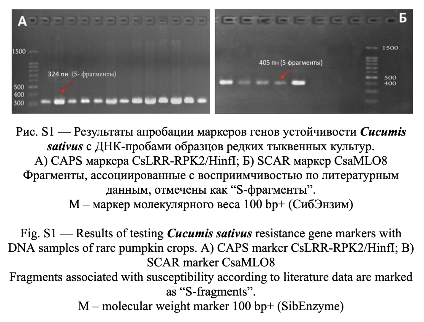 Тема Рис. S1. Результаты апробации маркеров генов устойчивости Cucumis sativus с ДНК-пробами образцов редких тыквенных культур.